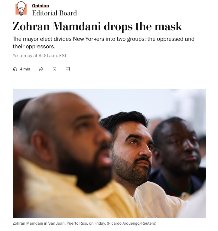Likewise Zohran declared, “Together, we will usher in a generation of change.” Far from divisive, Zohran could not have been more clear in his message of unity. But the Post continues in their alternate reality diatribe, and soon divulge what they actually deem as “divisive.”