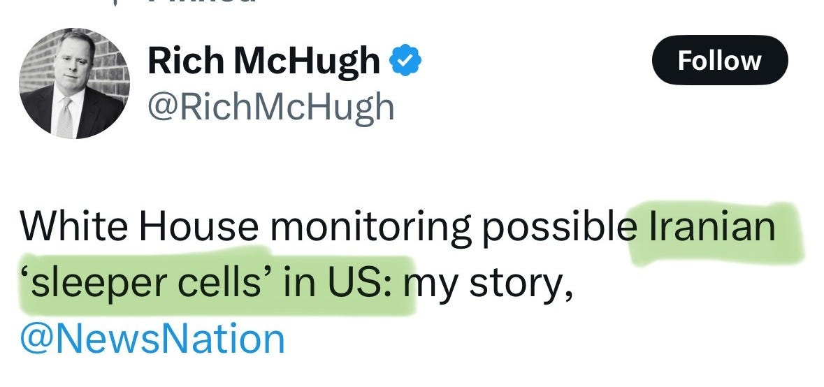 Indeed, the propaganda machine hasn’t changed a bit. They’ve just replaced “Iraq” with “Iran.” They’ve recycled the same Islamophobic tropes, just swapped out the name on the front of the folder. And once again, the media—particularly corporate outlets who cheerlead for empire—are amplifying it with little scrutiny and even less regard for truth. NBC cited anonymous White House sources to make the “sleeper cell” claim, and several influencers and outlets ran with it, claiming that just because NBC said it, it must be true.