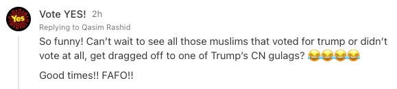 Other responses were much more sinister, making a mockery of the suffering of millions, and further laughing at the idea of American Muslims being “dragged off to one of Trump’s gulags.” And for good measure, added the same “FAFO” comment.