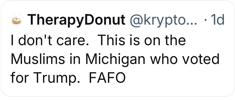 Meanwhile, American Christians (who still represent the majority of Americans) overwhelmingly voted for Trump three elections in a row. The majority of white Americans (who still represent the majority of Americans) overwhelmingly voted for Trump three elections in a row. To instead direct outrage at an already marginalized community that still overwhelmingly voted for Democrats—despite a genocide impacting their lives and families—is the height of absurdity and absolutely grounded in racism and otherizing of American Muslims. This is not a path for unity, but a path to further enabling Trump. We must demand and do better.