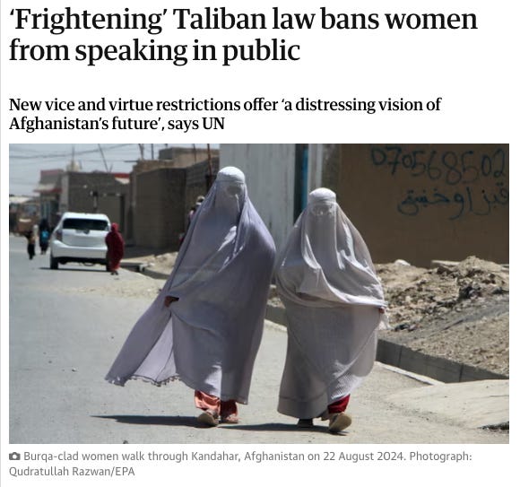 In Afghanistan, the Taliban's Minister of Education has announced that girls' schools are likely to remain closed permanently, affirming what was allegedly a temporary decision in 2022. Additionally, the Taliban has now banned women from so much as speaking in public.