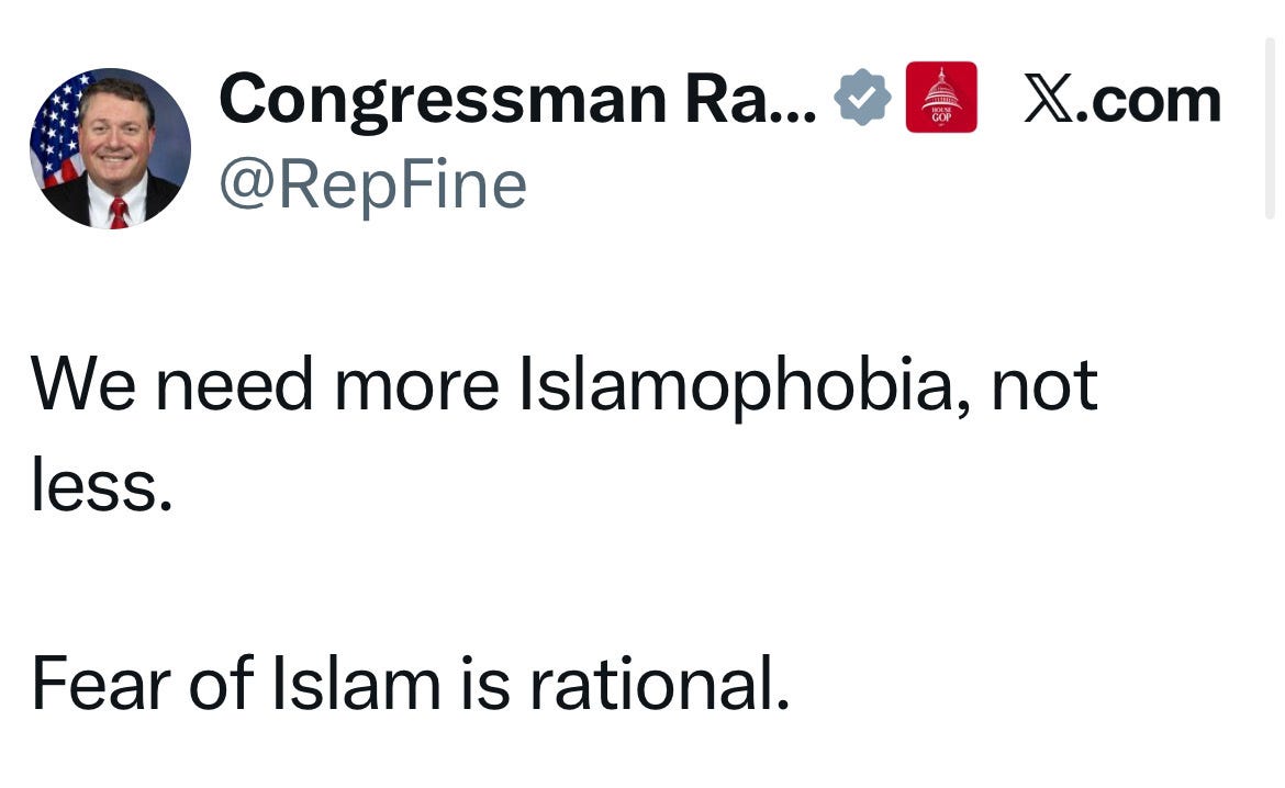 Rep. Randy Fine of Florida posted that “we need more Islamophobia, not less” and that the choice between dogs and Muslims “is not a difficult one” — a statement so extreme that it drew condemnation from Jewish leaders, CNN anchors, and Israeli-born former officials who called it reminiscent of the language used against Jews in Nazi Germany.