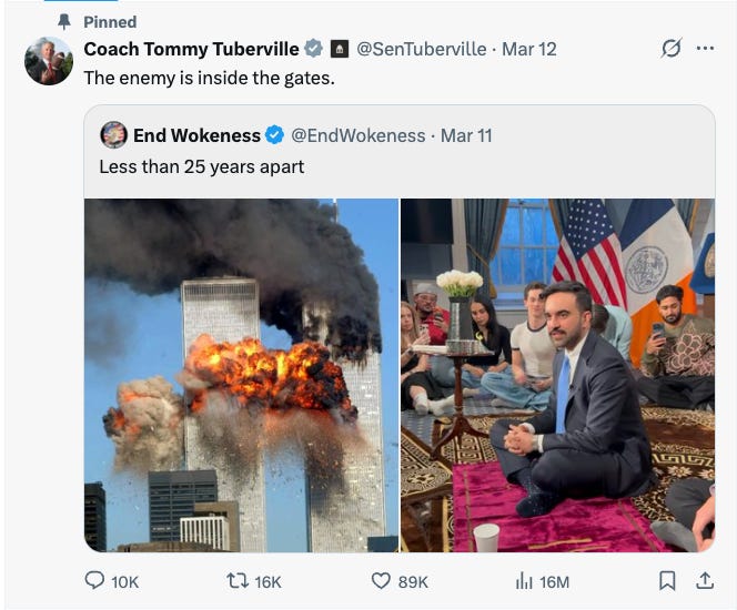 Senator Tommy Tuberville referred to Muslims as the “enemy inside the gate.” As of the writing of this article it is literally his pinned tweet on Twitter.