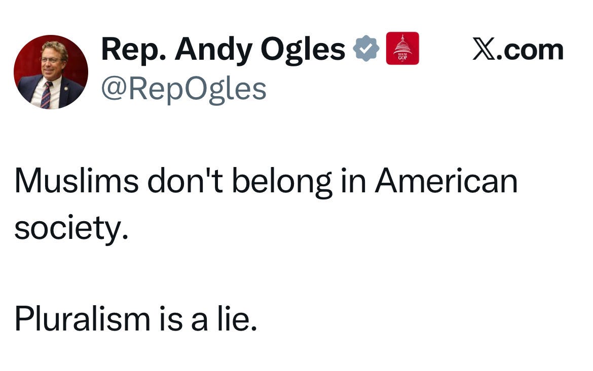 Rep. Andy Ogles of Tennessee declared that “Muslims don’t belong in American society” and that “pluralism is a lie.”