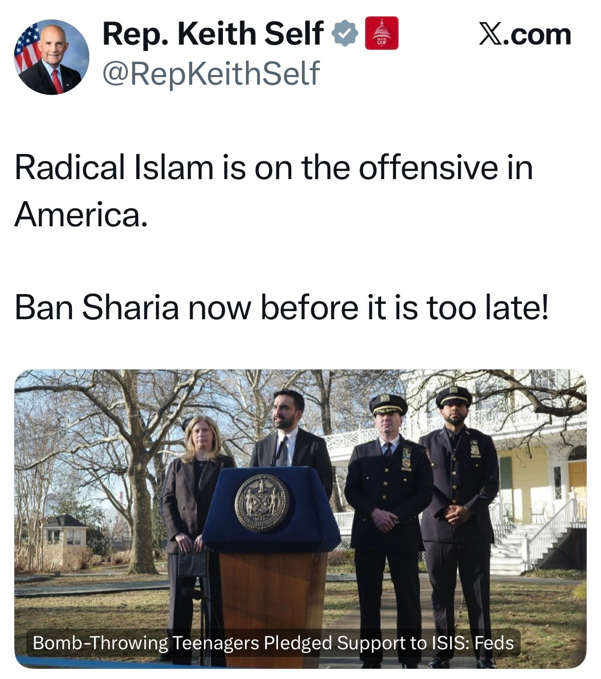 Likewise, Rep. Keith Self of Texas co-chairs what he has branded the “Sharia-Free America Caucus,” a congressional body now boasting 59 members across 24 states whose stated mission is to “save Western Civilization.”