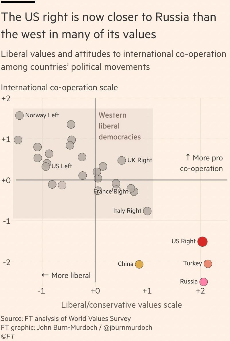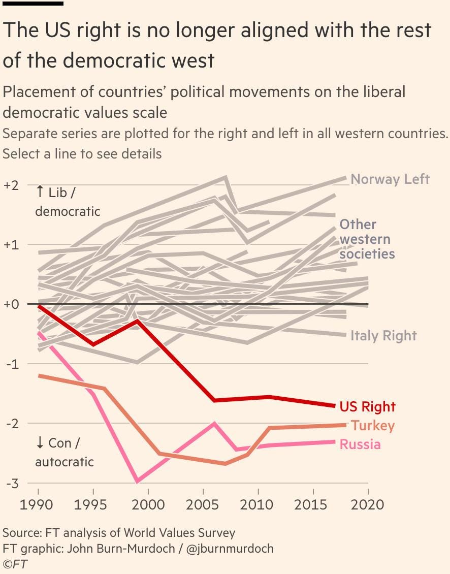 The next Financial Times chart shows how under the Trump regime, the United States has completely broken away from liberal democratic republics. It now instead mimicks the authoritarian regime of Russia. We must recognize that the aforementioned right wing narratives and these right wing politics are intimately connected.