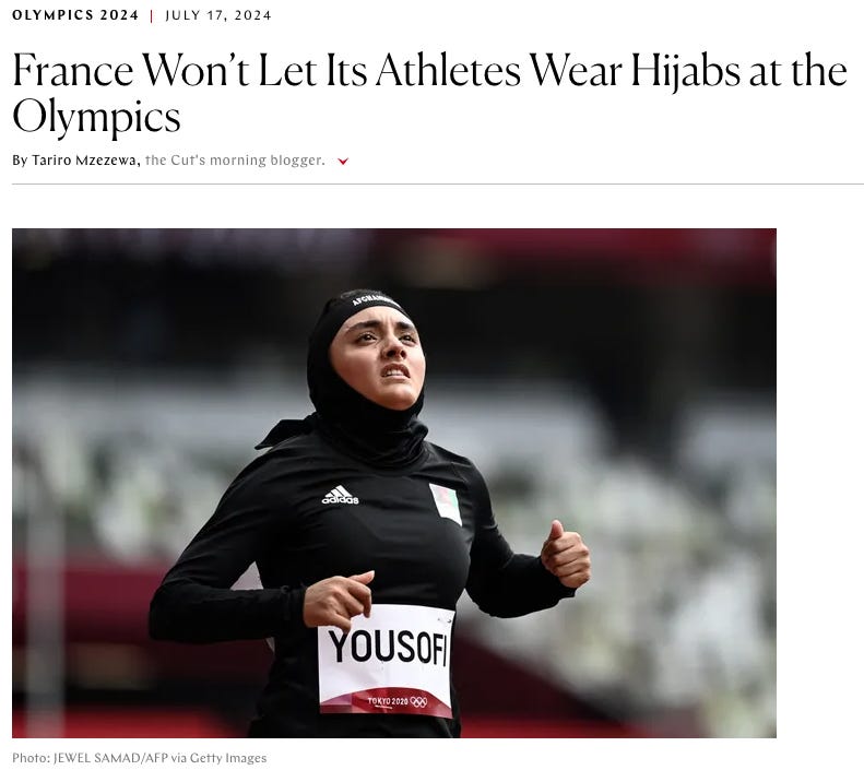 French Muslim women who choose to wear the hijab out of personal modesty are banned from competing in the Paris Olympics. Meanwhile, Alen Hadzic and Steven van de Velde—white men—committed sexual assault and rape of a minor, respectively, in violation of Olympic Ethics rules which ban sexual assault, are still allowed to compete in the Olympics unhindered.