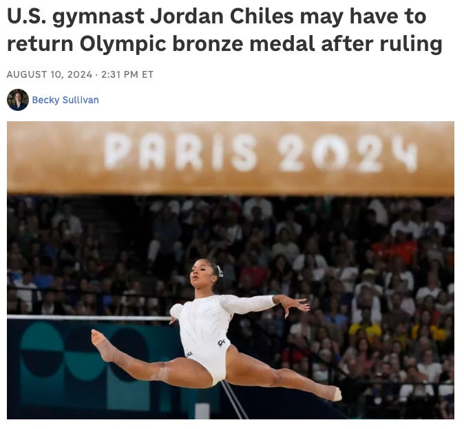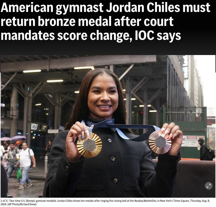 To be clear, Chiles performed better. She legitimately won the bronze. But because the judges screwed up, and Chiles didn’t call out their screw up fast enough—Chiles has to suffer the consequences of the judges and the IOC’s incompetence, and lose her bronze medal.