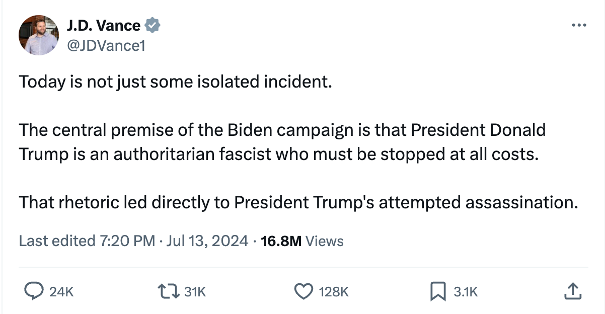Hours after a registered Republican white male shooter with a legally purchased firearm shot at Donald Trump, Ohio Senator JD Vance tweeted the below: