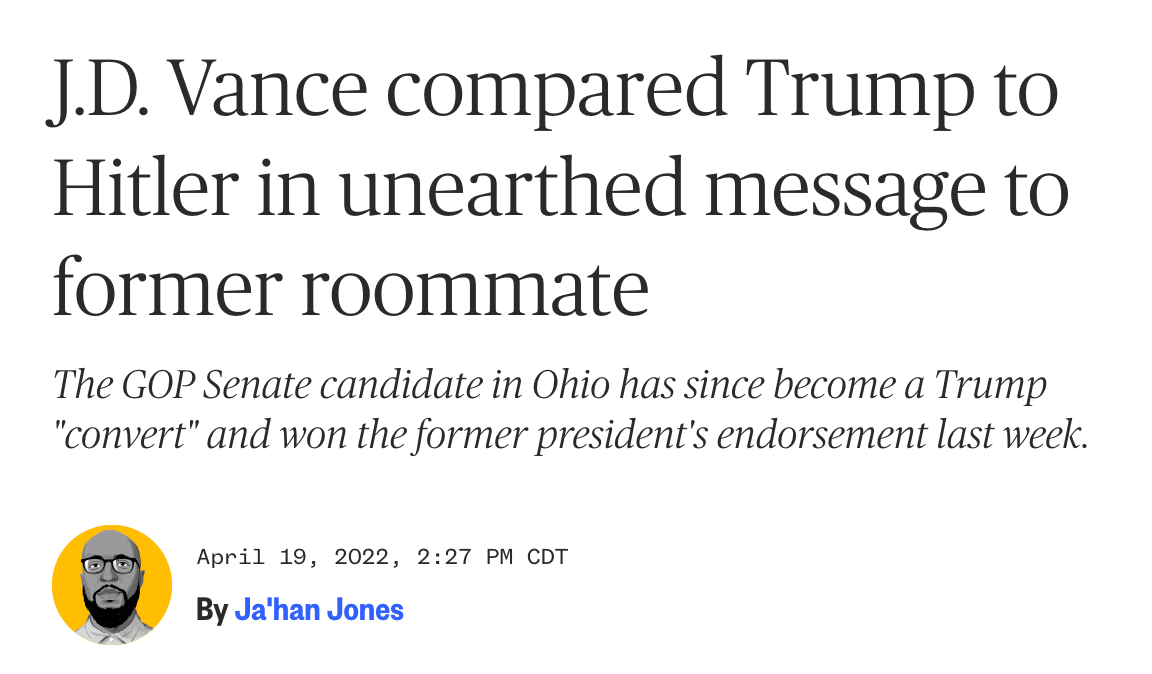 Vance additionally described Trump as “idiot,” “noxious,” and “reprehensible.” I have to say I agree. Therefore, while Vance now speaks of the need to decrease political violence and dangerous political rhetoric—when unclouded by the promise of unimpeachable power—JD Vance himself compared Donald Trump to Adolf Hitler. And now Vance remarkably blames others for agreeing with him, when he should be taking a victory lap for calling out Trump’s fascism before most anyone else on the right did.