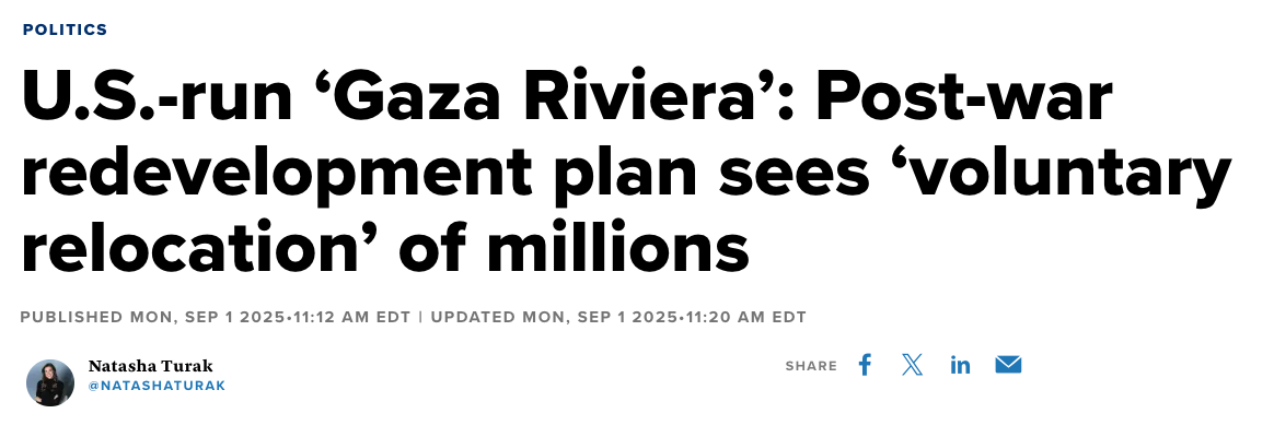 A new 38 page proposal shows Trump and Netanyahu are openly planning to take over Gaza and turn it into a casino and tourism resort. Palestinians will be offered $5000 for their land, 4 years of rent subsidies, and a year of food—if they decide to “voluntarily” leave. Note — this is ethnic cleansing and it is a war crime. If Palestinians don’t “voluntarily” leave, they’ll be placed into concentration camps and kept imprisoned. Note - this is genocide and a war crime.