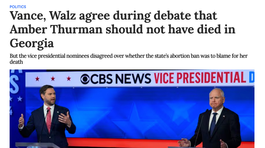 Governor Tim Walz won the debate hands down. He started visibly nervous but settled into his teaching and coaching routine, and delivered line after line of substance and decency. I appreciated that he took time out to reject demonization of immigrants, reject demonization of people who struggle with mental health illnesses, and uplift women like Amber Thurman and tell her story. Senator JD Vance spent his time lying to the camera and demonizing immigrants. That about sums up his strategy.