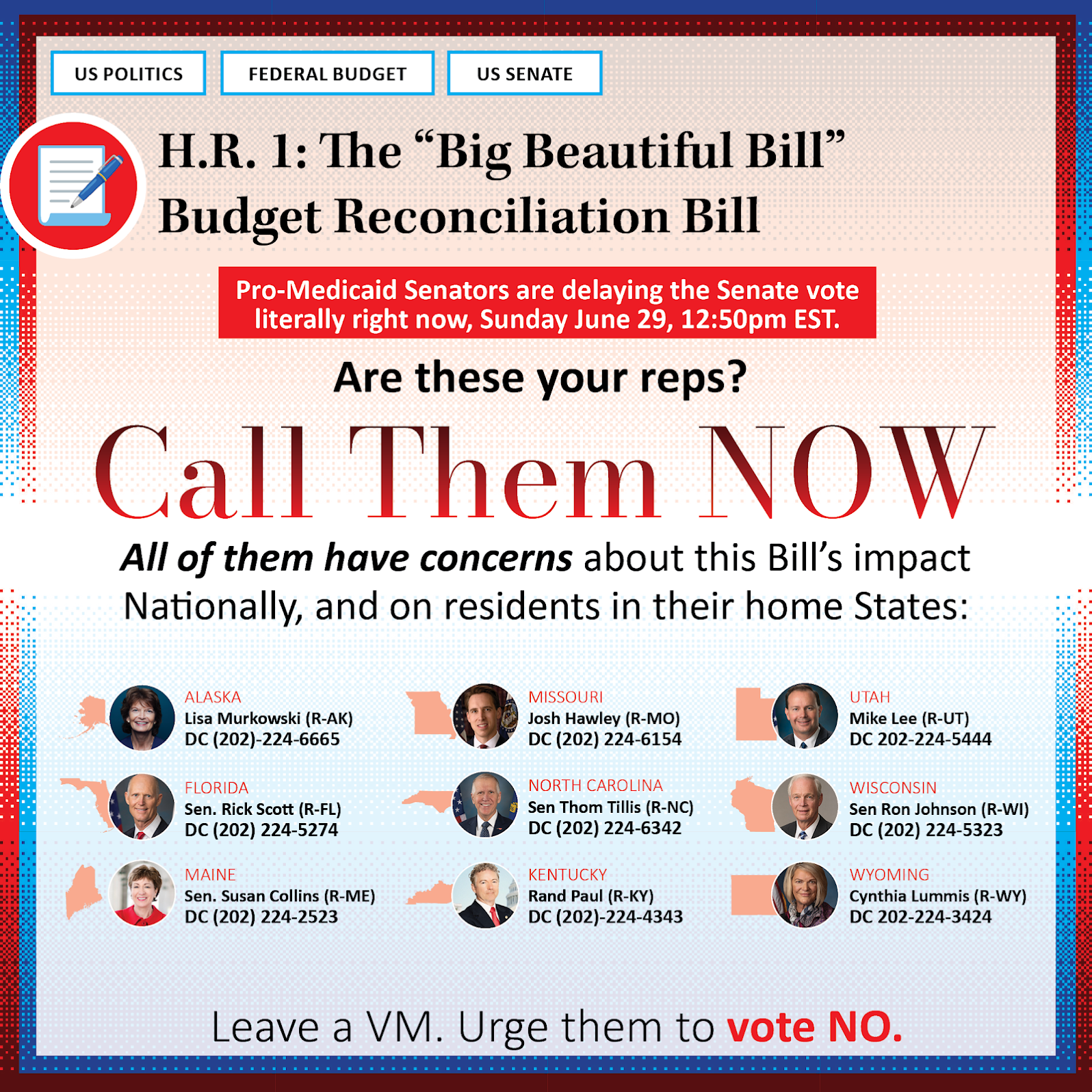 Hi, my name is [NAME], and I’m a voter from [CITY]. I’m calling with urgency to demand that [Senator NAME] vote NO on H.R. 1, the budget reconciliation bill.