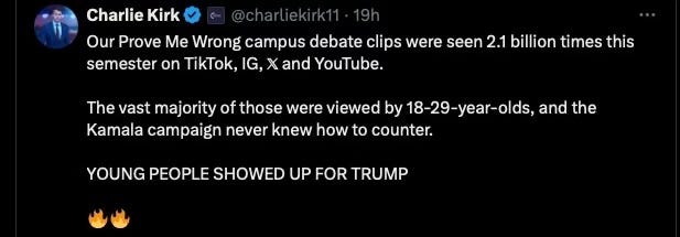 Let’s also acknowledge the continued failure of legacy media. From LA Times and Washington Post refusing to endorse any candidate, to CBS and CNN refusing to fact check the Presidential debates, to the New York Times whitewashing Trump’s clear cognitive decline—legacy media absconded in its responsibility to hold powerful politicians accountable. Many will note that while Biden’s age was a constant state of focus, the moment he resigned media completely forgot that Trump is only a few years younger than Biden.