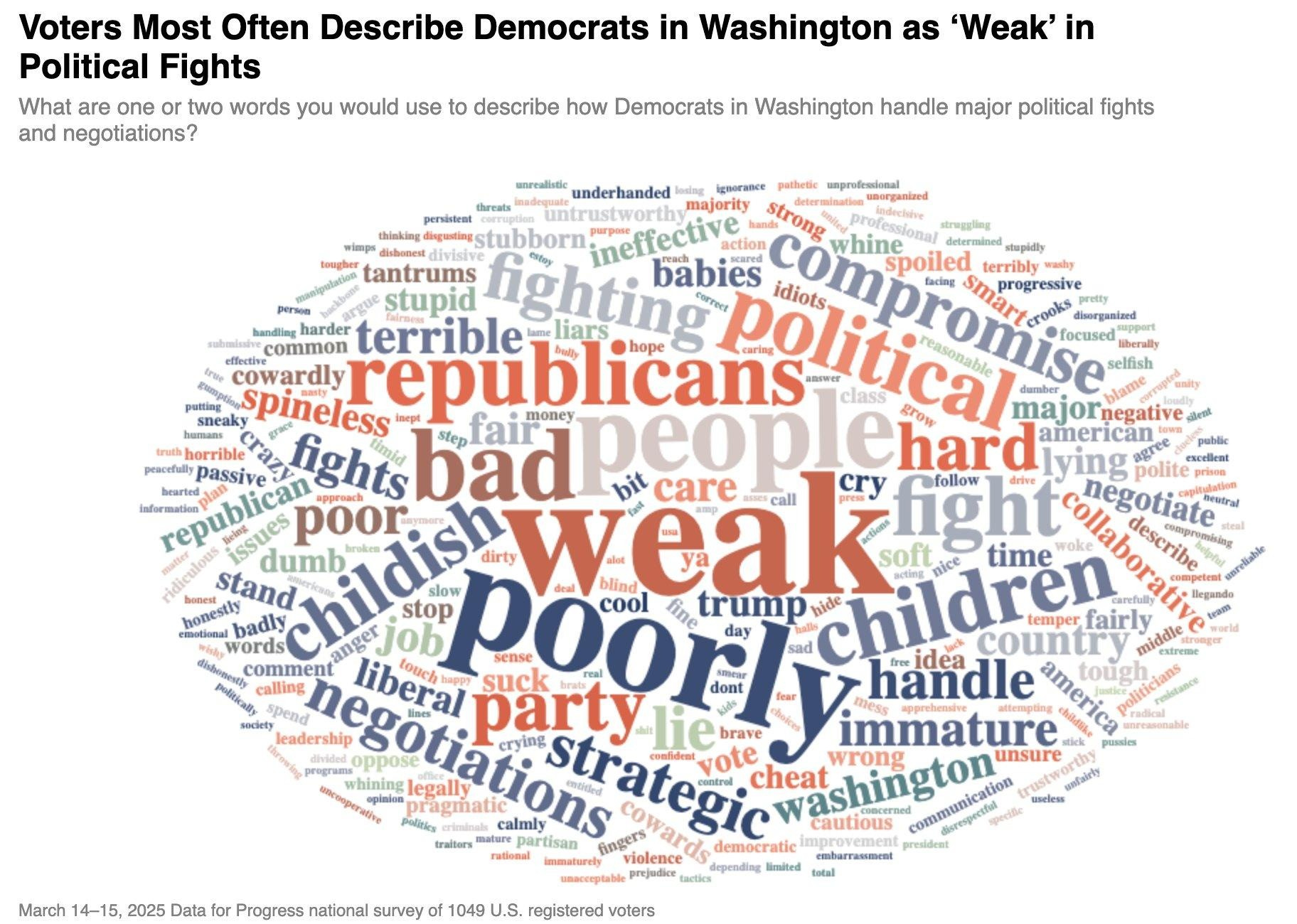 As we watch corporate Senate Democrats once again fold to Trump, remember that this isn’t the first time. And until we get them out of Congress, it won’t be the last either. They exemplify why we need new leadership. It’s no wonder that after Schumer capitulated to Trump on the budget bill last March, a poll asking registered voters what they thought of the Democratic Party revealed the below word cloud—with the most prominent word being WEAK.