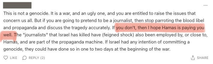 I’m not sure why you decided to become a paid subscriber while also defending genocide and accusing me of being “paid by Hamas.” That’s an absurd and outrageous accusation. It’s also an insult to the dozens of leading Jewish and Israeli scholars who call this a genocide. You have zero evidence for your backwards propaganda claims. You can either remove them, or I’m happy to cancel your paid subscription and refund you every penny. Your call.