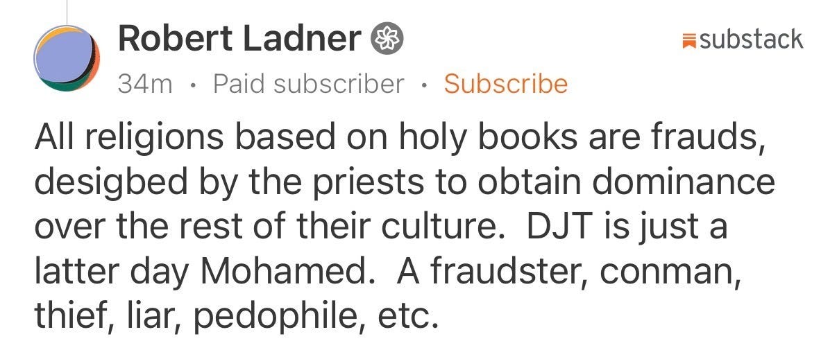 In response to my article condemning religious extremism, a paid subscriber responded with this frankly unhinged comment, espousing religious ignorance: