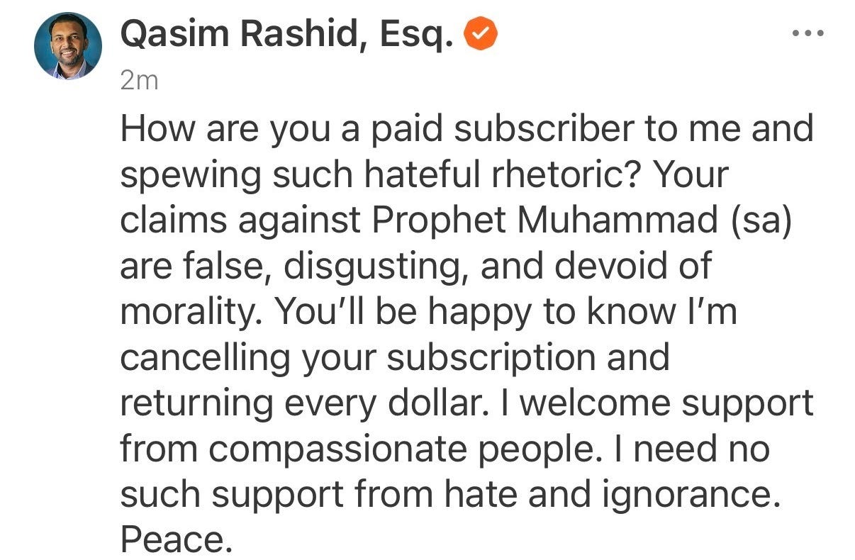 In response, I received anti-Muslim hate—not from opponents—but from paid subscribers. I cancelled their subscription and refunded their investment. Here’s the critical message I need to share with all of my readers. Let’s Address This