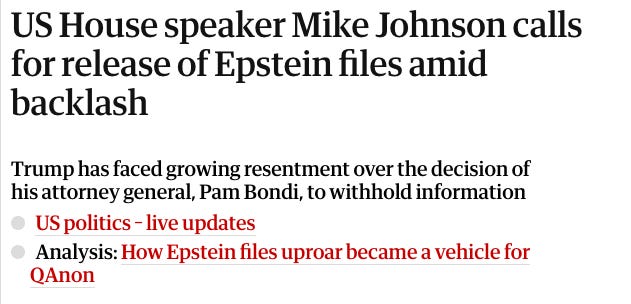 Sadly, Johnson’s vote doesn’t match his words, and when given the chance to release these files, he balked and ordered Republicans to vote unanimously to censor them. Meanwhile, Politico reports on numerous polls showing just how outraged Americans are at Trump’s handling of the Epstein matter: