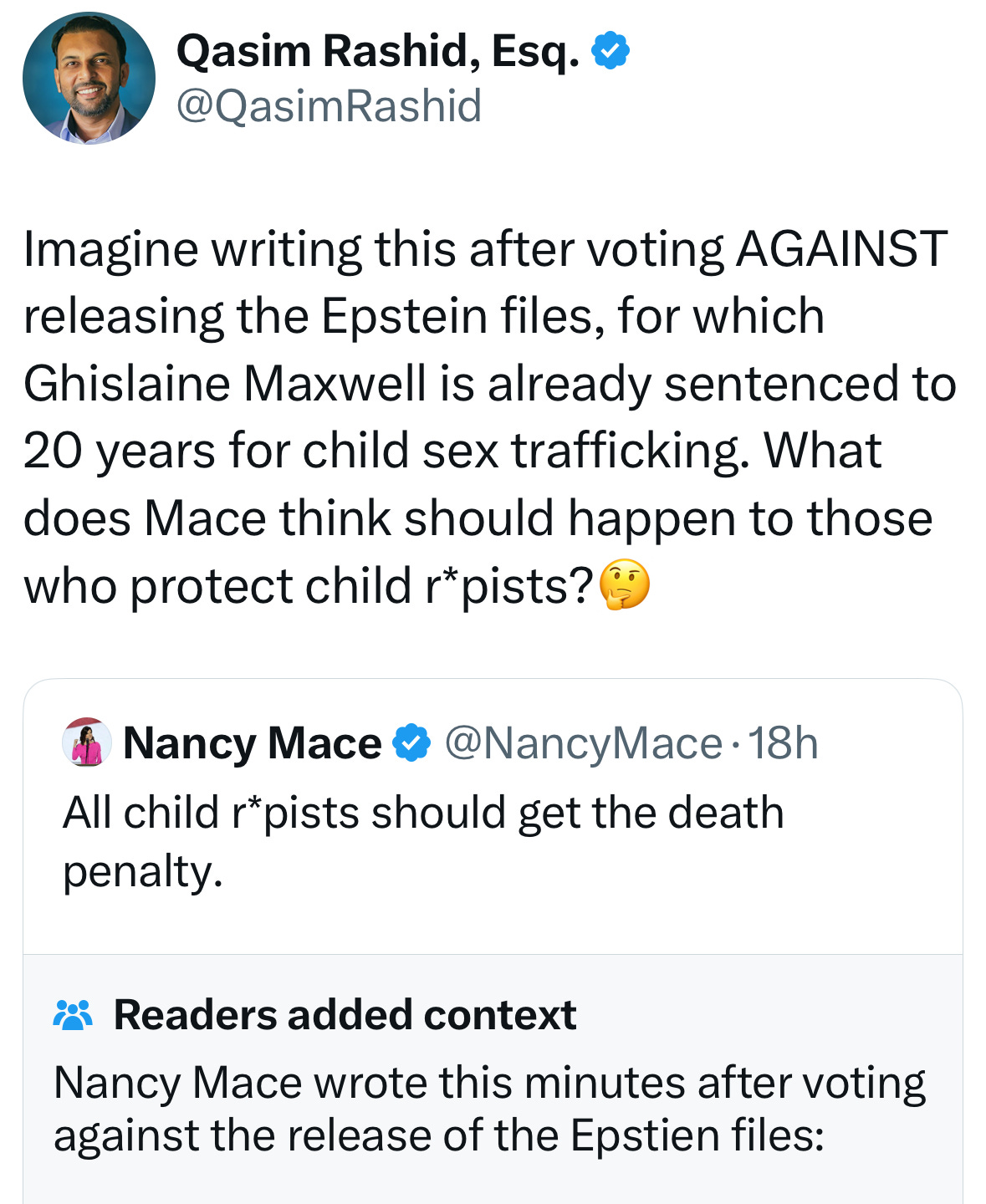This isn’t about policy. It’s about cruelty. Cruelty as governance. Hypocrisy as strategy. Because after all, if the Epstein files really don’t exist, then MAGA Republicans are claiming that Ghislaine Maxwell is serving 20 years behind prison on false convictions of child trafficking. So why aren’t they calling for her release? It’s quite simple—because they know she is guilty, and the fear Trump is as well.