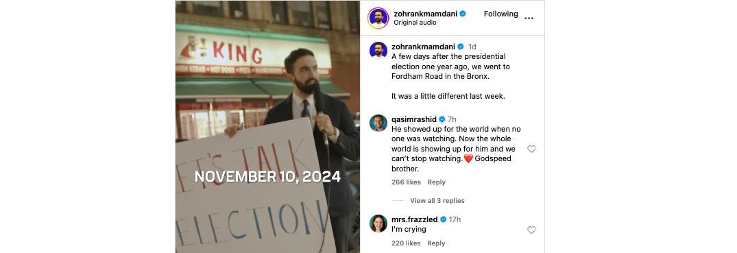 Let’s start on a lighter note and collectively pause for the important cultural impact here: Zohran Mamdani becoming mayor at 34 just ended the peace for every young South Asian man nationwide. As I joked when he won the primary, millions of Desi parents are right now loading up their guilt cannons: “Zohran was mayor of New York City at 34 — and you still haven’t bought a condo? Why can’t you be more like him?!” Dark days ahead for the brothas; we take this L together.